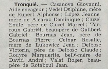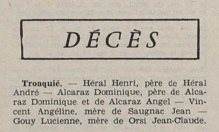 En las búsquedas realizas para ubicar a Dominique en su contexto aparecen algunas notas sobre la familia Alcaraz publicadas en la revista Mineurs d’Aquitaine. Por ella sabemos que Dominique trabajaba en las minas Tronquié, cerca de Carmaux, junto a sus hijos Dominique y Ángel. En abril de 1967 este medio hizo público el fallecimiento de Dominique padre. La madre, Juana López, había fallecido años antes, en 1958.