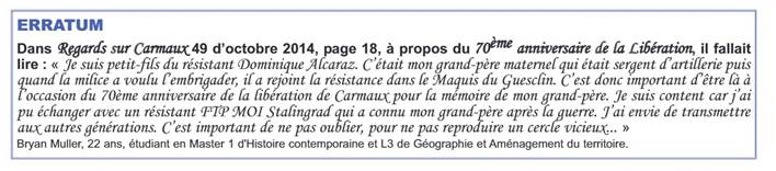 Por páginas genealógicas sabemos que había un Dominique Alcaraz nacido en Cartagena el 25 de octubre de 1918 y fallecido el 9 de noviembre de 2009 en Carmaux[2]. En ambos coincide el día y mes de nacimiento, pero no el año. Podría tratarse de un error de transcripción, pero lo normal es creer que sean padre e hijo. Una nueva información ayuda a completar un poco este relato. Se trata de una breve nota aparecida en la revista Regard sur Carmaux[3], de octubre de 2014 y enero de 2015. En ella un joven estudiante de historia habla de su abuelo Dominique Alcaraz, posiblemente hijo, combatiente de la Resistencia en las filas de Maquis de Guesclin.