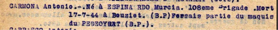 Antonio CARMONA (s/f, Espinardo). Antonio llegó hasta Francia con la Retirada, aunque la única información conocida está relacionada con su participación en la Resistencia y su muerte en combate. No hay fecha de nacimiento ni sabemos el recorrido que hizo hasta llegar al departamento de Bajos Pirineos (hoy Pirineos Atlánticos), donde se encontraba en 1944. En esa fecha ya formaba parte de la Resistencia.