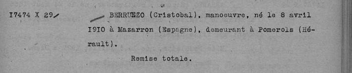 Cristóbal BERRUEZO GARRIDO[1] (08/04/1910, Mazarrón). Cristóbal había emigrado a Francia, seguramente siendo muy joven, estableciendo la residencia en Pomerols (Hérault). Fue nacionalizado francés el 22 de mayo de 1929.
