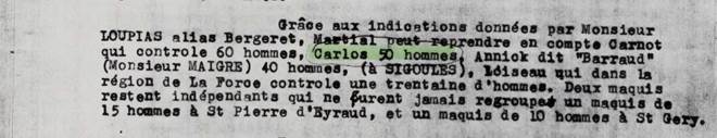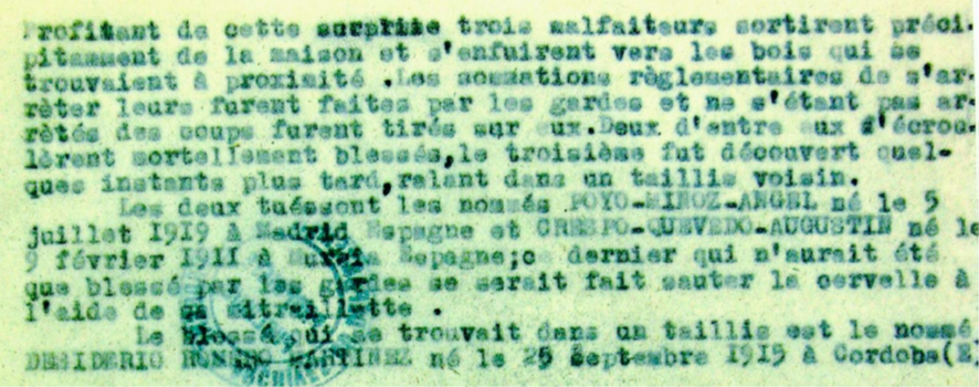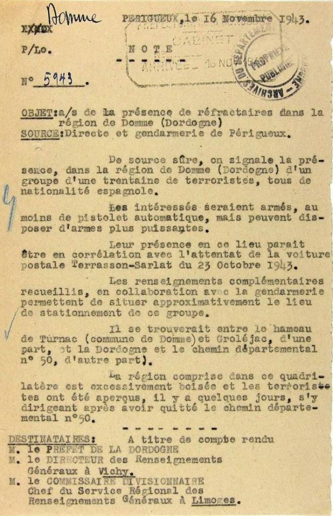 “En respuesta a mi informe del 18 de marzo de 1943 que concierne al asunto del ataque de un grupo de terroristas españoles, por una sección de la guardia de Bergerac en la región de Vérynes de Domme (Dordoña), tengo el honor de hacerle saber lo que sigue: