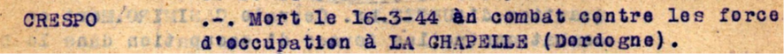 Agustín CRESPO QUEVEDO (09/02/1911, Murcia). La primera información sobre Agustín lo sitúa cruzando a Francia con la Retirada. Una vez en este país, fue internado en algunos de los campos de internamiento fronterizos hasta que fue destinado a la 197 CTE creada en Argelès[1]. Esta Compañía salió el 28 de enero de 1940 en dirección a l’Ile Jourdain (Vienne). Después de la debacle francesa fue devuelto a algún centro de internamiento, posiblemente a Rivesaltes[2] del que volvió a salir enrolado en el Grupo de Trabajadores extranjeros 643 de Aixe (Haute Vienne) cuyos miembros participaron en varias obras en Aixe-Sur-Vienne (construcción de puentes, de carreteras…), así como en explotación del bosque y en el campo. Los integrantes de esta GTE comenzaron a salir para la zona ocupada en 1943, quizá fuera la razón por la que el 15 de agosto de 1943 Agustín se fugó[3].