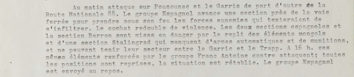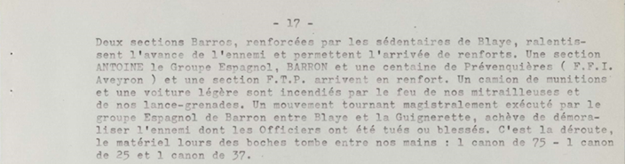 Los maquis Baron y Pi-Teixidor (grupo Español) tuvieron una actuación muy destacada en estos combates. El primero de ellos fue el responsable de la voladura del puente de la carretera de Cordes el primer día de combate. El día 17 el grupo Español se enfrentó a las fuerzas enemigas que se intentaban infiltrar por la línea del ferrocarril. La batalla fue descarnada. Un enfrentamiento que se intensificó tras la retirada del maquis Stalingrado al quedarse sin munición. El maquis Baron acudió de refuerzo. La actuación de los españoles durante ese día es elogiada en todos los informes. Al día siguiente, tras un breve descanso, se incorporaron para apoyar al maquis Baron que intentaba ralentizar el avance alemán hasta que llegaran refuerzos. De nuevo, una actuación del grupo Español, calificada como magistral, culminó con la desmoralización y derrota del enemigo. Habían volado por los aires, entre otros, el camión de municiones alemanes y sus oficiales resultaron muertos o heridos. Operación que proporcionó a la Resistencia gran cantidad de armamento pesado.