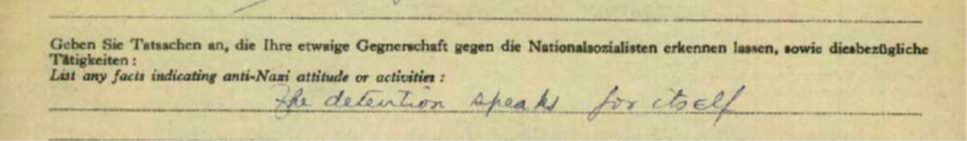 Durante ese proceso Roque, como el resto de presos, tuvo que cumplimentar un cuestionario en el que aportaba los datos básicos desde su captura. Una de las preguntas se refería a las actividades anti-nazi que motivaron su detención, Roque respondió con una fórmula que utilizaron muchos españoles: “la detención habla por sí misma”.
