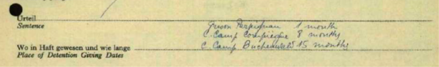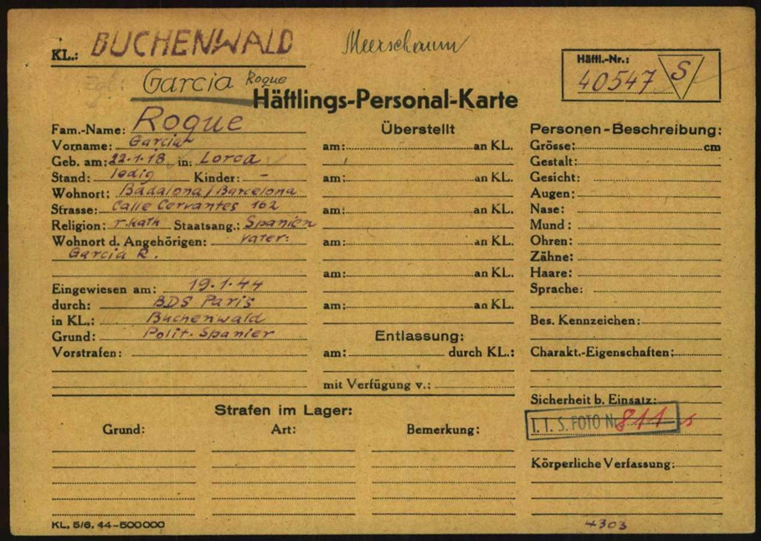 A su entrada llevaba una caja de cartón con varios pares de zapatos, una chaqueta, un suéter, una camisa, dos bufandas, tres pantalones de trabajo, un par de zapatillas de casa, un par de botines, utensilios de afeitar, entre otras pertenencias que le fueron confiscadas. Se trata de un caso atípico, pues los prisioneros ingresaban con poco más de lo que llevaban puesto. Estuvo destinado a diferentes Kommandos: E12 Quade Schöndorf en marzo de 1944, Entwässerung (“Drenaje”) y Baukommando III en junio de ese año, Lagerartz durante el mes de enero de 1945 y Holzhof en febrero del mismo año. Como familiar de referencia designó a su padre R. García, residente en Badalona[3].