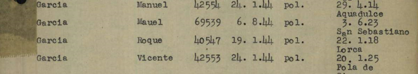 Roque GARCÍA (22/01/1918, Lorca). La familia había emigrado a Barcelona y se había establecido en calle Cervantes, nº 162 de Badalona. Soltero y de profesión cristalero. Durante la Guerra Civil combatió con el ejército republicano. Tras la derrota, en 1939, se exilió a Francia. No se conocen los datos de su trayectoria: campos de internamiento por los que pudo pasar, Compañías de Trabajadores Extranjeros…, hasta que se estableció en Lyon (Rhône), en el número 7, Chemin de la Plaine, Clos Colomb.