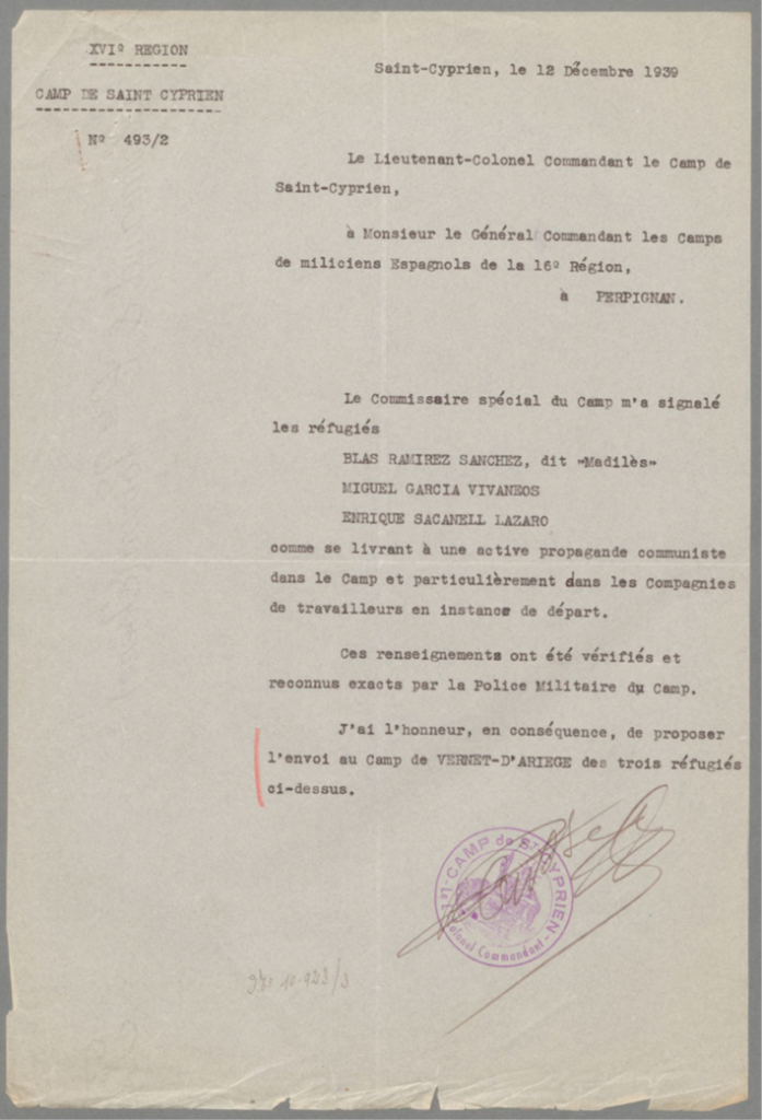 En 1939, tras la derrota del ejército gubernamental, como responsable del sector de Puigcerdà, se encargó de la evacuación del ejército a Francia. Cruzó la frontera el 13 de febrero, siendo internado en Saint Cyprien. En diciembre de este año las autoridades francesas -prefectura y policía de Pirineos Orientales-, determinaron que debido a su peligrosidad debía ser internado en un campo de castigo, por lo que fue propuesto para ser enviado a Vernet. A partir de ahí figura en diversos documentos, a lo largo de diciembre de 1939, junto a diferentes nombres de internados considerados peligrosos, o sospechosos, y las razones por las que fueron señalados.
