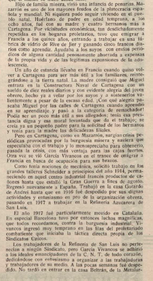 Miguel GARCÍA VIVANCOS (19/04/1895, Mazarrón). Hijo de Miguel, obrero, y María de la Exaltación, padres de cuatro hijos. En 1903 la madre, ya viuda, y sus hijos se trasladaron a Cartagena. Miguel empezó a trabajar con 13 años en el Arsenal de Cartagena. Fue el inicio de una larga e intrincada trayectoria que quedó plasmada en el reportaje publicado en 1938 en Mi Revista, prensa ilustrada de la época.