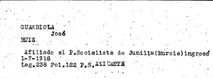 José GUARDIOLA RUIZ (05/05/1897, Jumilla). Hijo de Antonio Guardiola y de Juana Ruiz. Albañil, con estudios primarios, casado con Daría Urquiza, padres de cuatro hijos. Era militante socialista y afiliado a la UGT. De su militancia en la izquierda y su compromiso con la República dejó constancia en numerosos documentos[1].