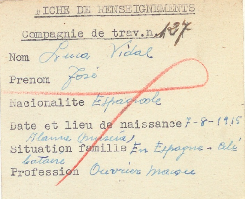 José LUCAS VIDAL (07/08/1915, Alhama de Murcia)[1]. Era albañil y estaba soltero. Debió combatir en España con las fuerzas gubernamentales. Al terminar la guerra se tuvo que exiliar a Francia, dejando a su familia en España. Fue el inició de un proceso tormentoso, como el de gran parte de los refugiados españoles de 1939.
