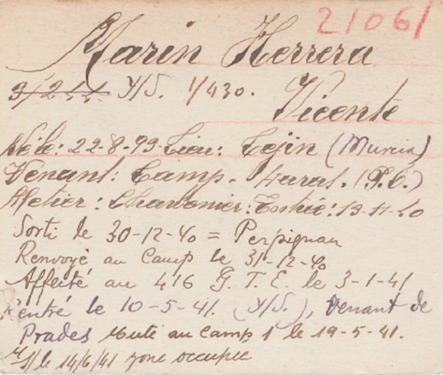 Fue el inicio de un dilatado recorrido entre diferentes campos de internamiento y Compañías de Trabajadores Extranjeros. Desde Bram salió con un destino desconocido integrado en alguna Compañía de Trabajadores Extranjeros (CTE), en la que estuvo hasta el 13 de noviembre de 1940, fecha en la que ingresó en Argelès procedente del campo de Haras, en Perpignan. El 30 de diciembre de 1940 un nuevo registro indica que salió del campo, Argelès, a Perpignan y regresó al día siguiente. Unos días después, el 3 de enero de 1941 fue incorporado al 416 Grupo de Trabajadores Extranjeros, en Prades. En este grupo estuvo hasta el 10 de mayo de ese año, día en el que fue devuelto, de nuevo, a Argelès. Esta última estancia fue corta, algo menos de un mes, porque el 14 de junio partió para la Zona Ocupada[5].
