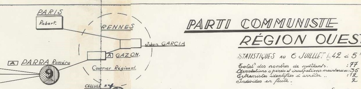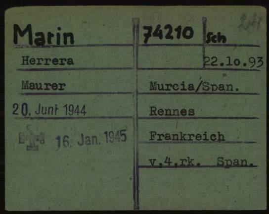 Empezó entonces a trabajar para los alemanes en las obras del “Muro atlántico”, en los alrededores de Brest (Bretaña), y estuvo instalado en el campo de refugiados de Guilers. Después se trasladó a Rennes (calle Saint Maló, nº 70 y Saint Georges, nº 23) para trabajar como albañil y encofrador en la empresa constructora de Philipp Epple, en el aeródromo de Saint-Jacques-de-la-Lande. Aquí coincidió con Diego Quevedo Melgarejo, del Llano del Beal, miembro de la Red Deportistas, organización de la Resistencia española del Partido Comunista y de la UNE (Unión Nacional Española). Casi todos los integrantes de esta organización, entre 44 y 65, fueron detenidos en marzo de 1944 en Rennes, algunos de sus integrantes fueron fusilados o deportados a Alemania[6]. Detenciones que se extendieron por varios departamentos franceses, especialmente en Bretaña. Es posible que Vicente formara parte de este grupo o tuviera relación con él, aunque no figura entre los militantes descubiertos por las fuerzas represivas francesas y alemanas[7].