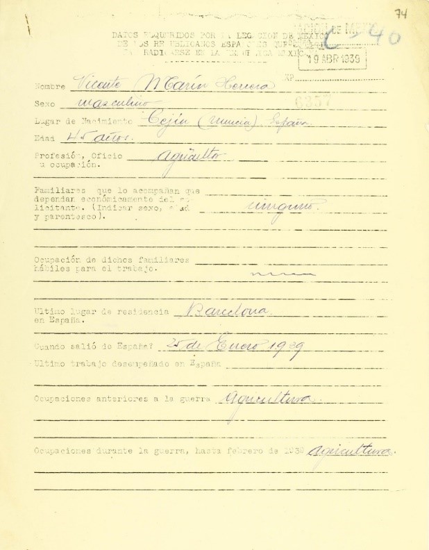 Mientras estaba en Bram solicitó emigrar a México. En la petición declaró que era agricultor, de 45 años, militante de la CNT, carente de recursos para afrontar el viaje, así como su deseo de permanecer indefinidamente en ese país una vez obtenida la nacionalidad[4].
