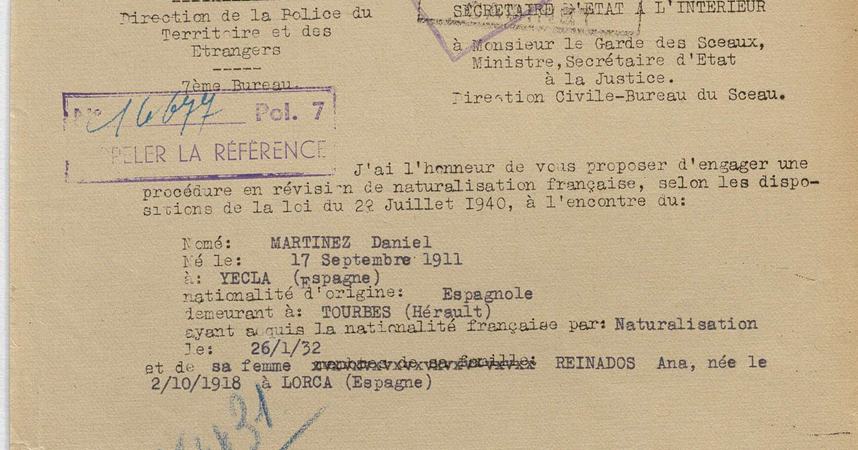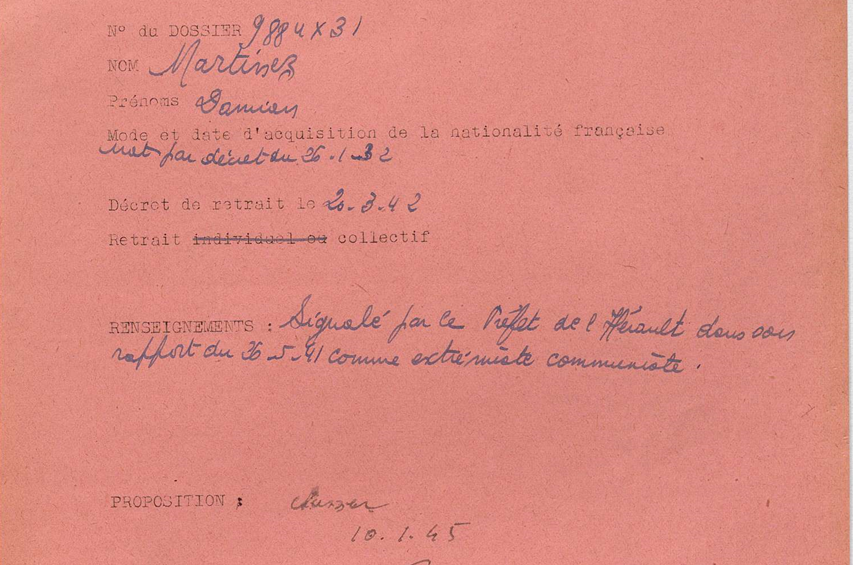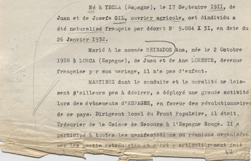 Damián MARTÍNEZ GIL (17/09/1911, Yecla). Hijo de Juan y Josefa, trabajadores agrícolas. La familia de Damián había emigrado a Francia en 1920, cuando Damían sólo tenía 9 años. Se establecieron en Tourbes, donde el padre trabajaba como viticultor, profesión que siguió el hijo. En 1932 obtuvo la nacionalidad francesa, por entonces estaba soltero y vivía con los padres. En 1938 se casó con Ana Reinaldos, natural de Lorca. En 1940, cuando Francia entró en guerra, fue incorporado al ejército. Sirvió en la 363ª Semi-Brigada de Infantería Alpina, en Bonifacio (Córcega). Resultó herido en un brazo, por lo que tenía un reconocimiento de invalidez inferior al 10%, recibiendo por ello una indemnización del gobierno alemán[1].