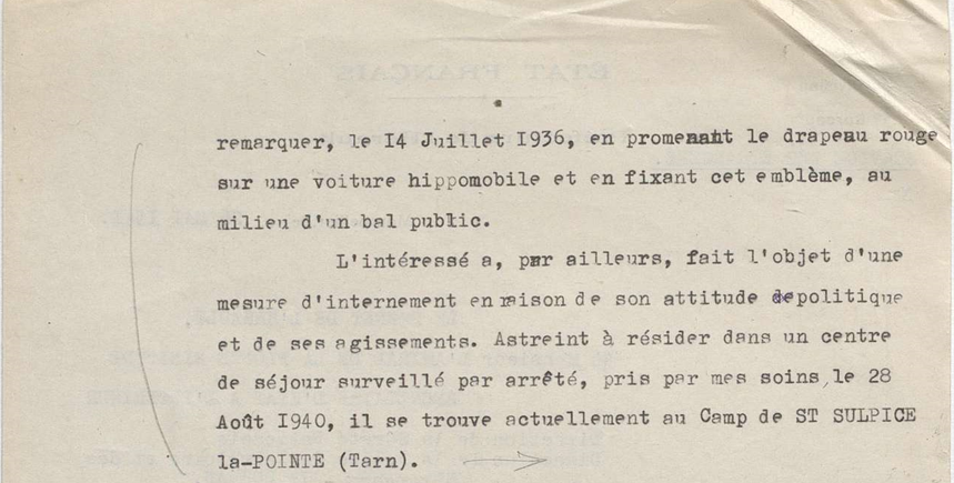 Su activismo político dio como resultado una orden de detención y posterior internamiento. La orden la dio el Prefecto de Hérault el 28 de agosto de 1940 y fue detenido el 16 de septiembre. A partir de ese momento fue enviado a los centros de detención de Chateau Saint Ange, Revel (Haute Garonne) y Saint- Sulpice-la-Pointe (Tarn) sucesivamente. El 30 de octubre de 1940 ingresó en el centro de detención vigilada de Saint-Sulpice-la-Pointe, denominación que evita el término prisión, que es lo que realmente era. Por todo ello, las autoridades francesas consideraron que su conducta moral era mala, sin la menor duda, por lo que se recomendaba que se le retirara la nacionalidad francesa.