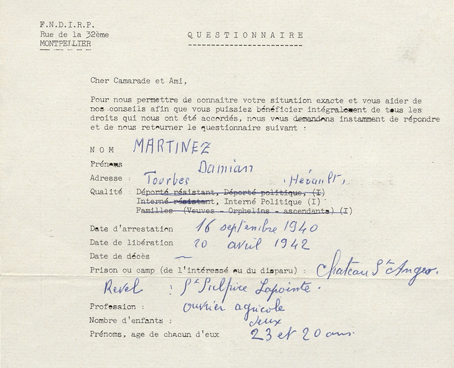 Durante ese mismo periodo Damián también realizó las gestiones para solicitar el reconocimiento y homologación de pertenencia a la Resistencia y por el tiempo que pasó en prisión. Entonces seguía residiendo en Tourbes, era padre de dos hijos y trabajaba como obrero agrícola. El cuestionario que se conserva lleva el membrete de la Federación Nacional de Deportados e Internados, Resistentes y Patriotas (FNDIRP) de Montpellier, aunque está registrado en la sección de Pézenas.