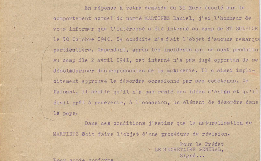 Dentro del proceso de desnaturalización se requirieron informes al Prefecto de Tarn sobre el comportamiento de Damián desde su ingreso en prisión. En la respuesta se destaca que su conducta fue normal hasta el motín del 2 de abril de 1941. El internado “no consideró oportuno distanciarse de los responsables”, por lo que se podía considerar que aprobaba implícitamente el desorden causado por sus compañeros de prisión. Actitud que demostraba que no había renunciado a sus antiguas opiniones y que en cualquier momento podía convertirse en fuente de desorden en el país. No hay documentos que indiquen que Damián fue juzgado o condenado. Se trataría, por tanto, de un preso por decisión del Prefecto y, según su propia declaración, por defender la causa republicana en España.