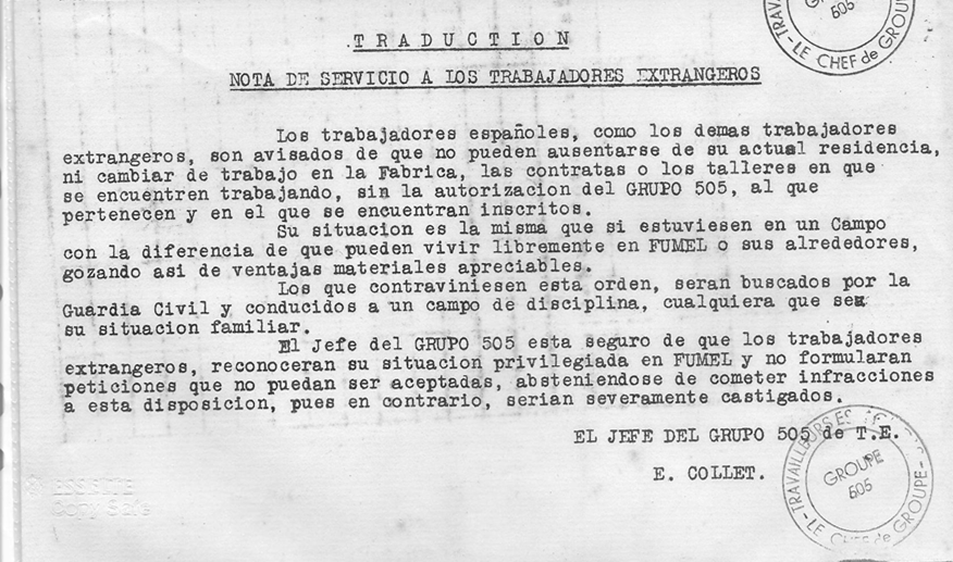 La alta concentración de republicanos españoles preocupó a las autoridades, especialmente a la gendarmería, que rápidamente solicitó la creación de un Grupo de Trabajadores Extranjeros en esta localidad. Fue el 505 GTE y todos los extranjeros estaban obligados a inscribirse, incluidos los que trabajaban en propiedades agrícolas. Debían, además, aceptar unas estrictas condiciones de funcionamiento. El principal objetivo era controlar a los trabajadores de la S.M.M.P. El grupo entró en funcionamiento en julio de 1941, fecha en la que fue registrado Juan.