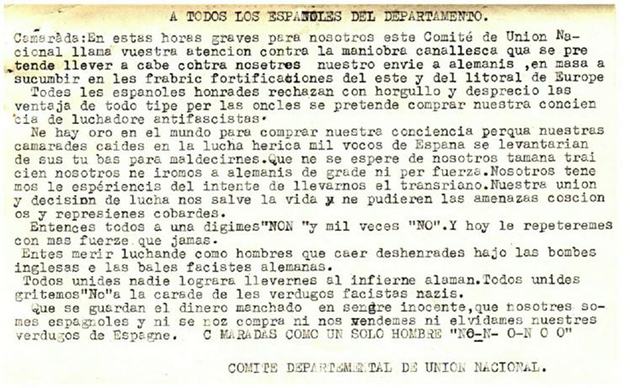 Estos comités tenían como objetivo el regreso a España, para acabar con la dictadura de Franco, pero también se planteaban la lucha contra los alemanes en una Francia recién ocupada. La primera batalla estuvo destinada a conseguir que ningún español aceptara trabajar para los alemanes, ni en Alemania ni en Francia. El lema “Liberar Francia para Liberar España”.