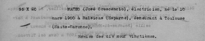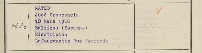 José Crescencio MATEO (09/03/1900, Balsicas, Murcia). Emigrado a Francia con anterioridad a la Guerra Civil, durante los primeros años del siglo XX. Se estableció en el departamento de Haute Garonne y residía en Toulouse, en la calle Fourcade, del barrio de Lafourguette, al sur de la ciudad. Era electricista. Obtuvo la nacionalidad en 1927.