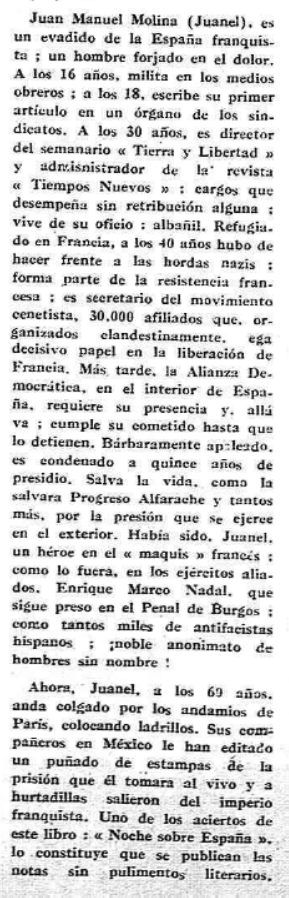Juan Manuel MOLINA MATEO “Juanel” (04/08/1901, Jumilla)[1]. Nació en una familia de militantes anarquistas, camino que él siguió desde muy joven. Pronto se afilió al Centro Obrero de Jumilla, donde asumió distintas responsabilidades. Su primera detención se prodjo cuando tenía 18 años. Fue un temprano insumiso, al negarse a hacer la mili. Poco después emigró a Badalona y vivió con una identidad falsa. Trabajó en una cooperativa de construcción y, años más tarde, se ganó la vida de albañil. La actividad dentro de Movimiento Anarquista le obligó a un primer exilio a Francia, país del que fue expulsado tras varias detenciones. Empezó una nueva etapa en Bélgica. En 1930 regresó a Barcelona y continuó asumiendo cargos de gran responsabilidad dentro de la organización hasta que fue nuevamente detenido. Salió liberado el 19 de julio de 1936. Durante la Guerra Civil fue Comisario de los Cuerpos X y XI del Ejército. Estaba casado con Lola Iturbe, miembro de la Confederación Nacional del Trabajo (CNT), una de las fundadoras del movimiento anarco-feminista Mujeres Libres y del Comité de Milicias Antifascistas durante Guerra Civil[2]. Reportera de guerra y escritora. Participó, junto a Juanel, en la Resistencia francesa.