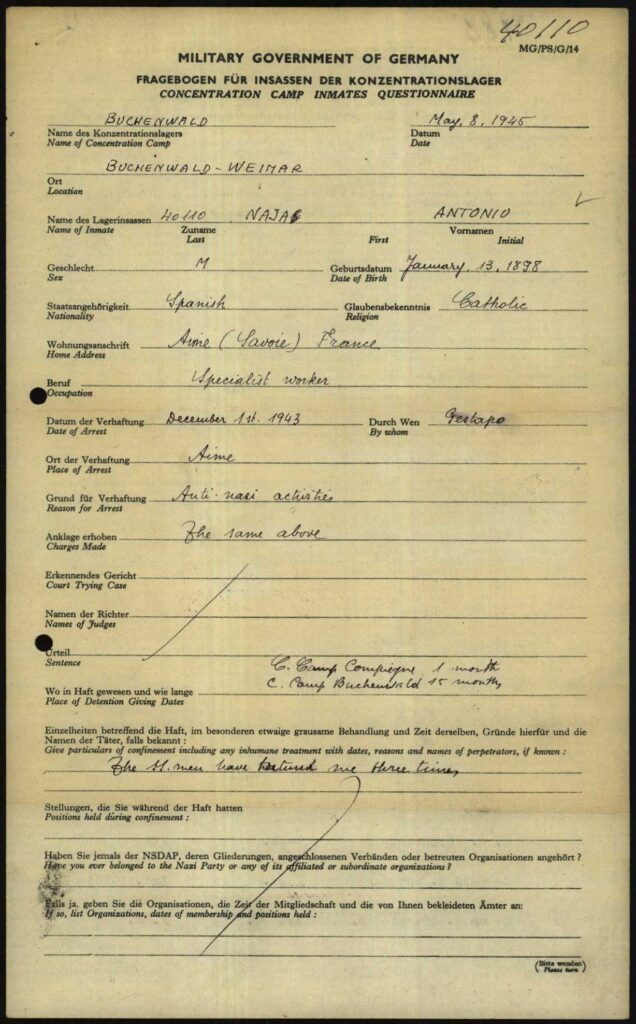 En su declaración ante las autoridades militares estadounidenses, el 8 de mayo de ese año, afirmó haber sido torturado en tres ocasiones por las SS, así como su deseo de regresar a Francia. Una de las preguntas del cuestionario que debía cumplimentar se refería a las actividades anti-nazi que motivaron su detención, Antonio respondió con una fórmula que utilizaron muchos españoles: “la detención habla por sí misma”.