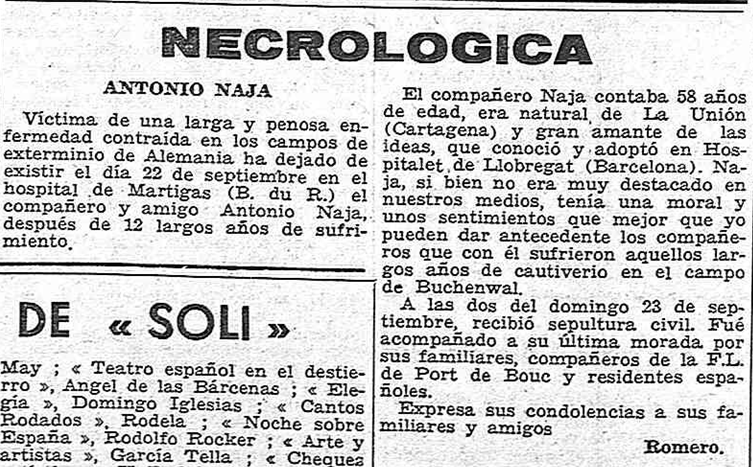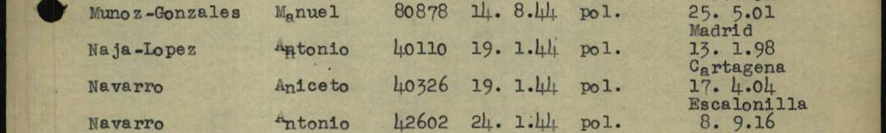 Antonio NAJA LÓPEZ[1] (13/01/1898, Llano del Beal, Cartagena). Hijo de José y de Juana. La familia emigró a Cataluña, estableciéndose en Hospitalet de Llobregat (Barcelona), donde se afilió a la Confederación Nacional del Trabajo (CNT)[2]. Antonio, que era analfabeto, trabajó como minero y se casó con Ana Carmona, con la que tuvo tres hijos. Durante su estancia en Barcelona cambió varias veces de domicilio. Combatió el fascismo en España después del Golpe de Estado de 1936 y en defensa de la legalidad republica durante la guerra.
