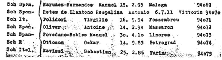 Antonio llegó a Vernet, desde Lyon, el 15 de abril de 1944. El 30 de junio los alemanes evacuaron el campo y remitieron a Antonio, junto al resto de presos, a la prisión del cuartel Caffarelli de Toulouse y después a la prisión de Burdeos, donde, tras ser clasificado como “preso preventivo español”, partió el 9 de agosto en el convoy conocido como “tren fantasma” con rumbo al campo de concentración de Dachau, en el que ingresó el 28 de agosto. Fue registrado con el número 94.072 y asignado al barracón 30, el de los inválidos. Entonces Antonio ya tenía 50 años y debió ingresar con un estado de salud muy precario. Murió el 8 de febrero de 1945[3].