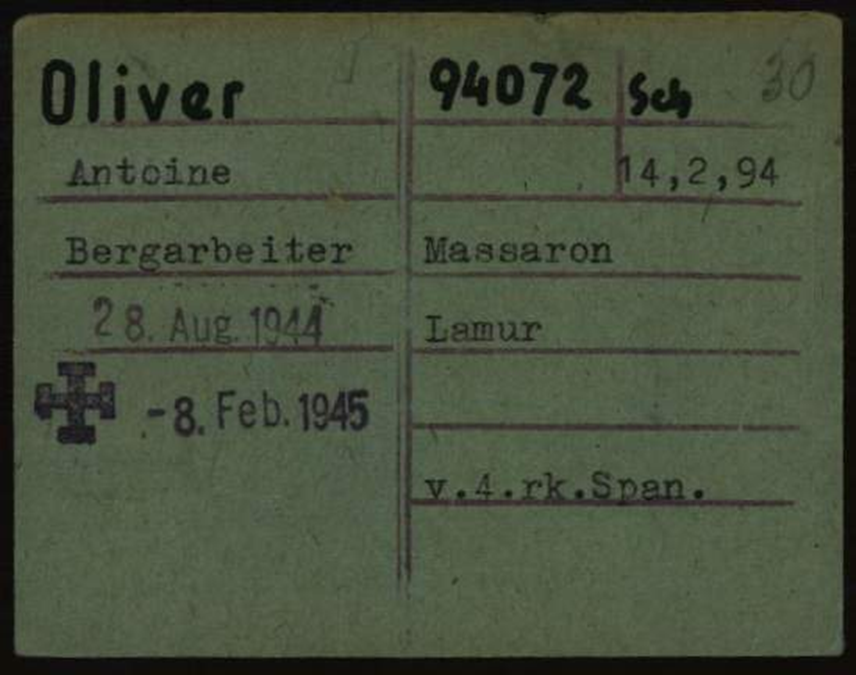 Antonio OLIVER GILABERT (24/01/1894, Mazarrón)[1]. Hijo de José Oliver Martínez, sereno de profesión y Concepción Gilabert Rubio, residentes en la calle Larga de Mazarrón. La familia emigró a Francia antes de 1915. Antonio trabajó como minero en La Motte d’Aveillans, una localidad minera cercana a Grenoble (Isère) y allí contrajo matrimonio el 8 de marzo de 1924 con Francisca García Bosc, natural de Barcelona, con quien tuvo cuatro hijos. Sus tres hermanos y sus respectivas familias obtuvieron la nacionalidad francesa entre 1928 y 1938.