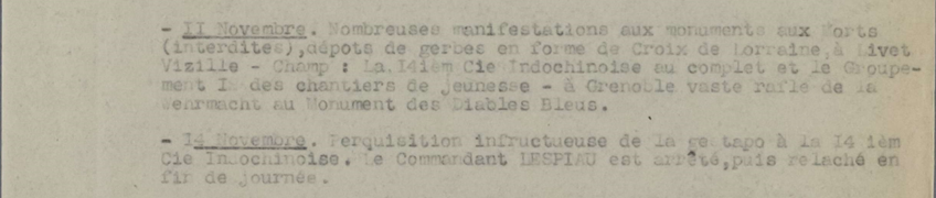 “… fuimos a depositar una corona de flores en la Puerta de Francia, pero la policía montada bloqueó el puente. Fuimos a la Place Grenette, donde abucheamos a la milicia, y luego al monumento de los Diablos Azules [en el Parque Mistral] cantando La Marsellesa. Al salir, los alemanes nos rodearon”[3].