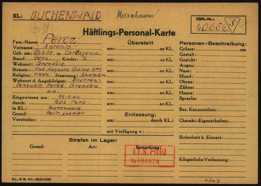 Antonio estuvo recluido en el campo de tránsito de Compiègne hasta el 17 de enero de 1944. Ese día, después de haber sido calificado por la BDS de París como “preso político español” salió con destino al campo de concentración de Buchenwald. Su detención se enmarcó dentro de la “Operación Meerschaum”. Operación de “reclutamiento” de mano de obra en Europa Occidental, puesta en marcha a finales de 1942 por Heinrich Himmler. Contemplaba la reclamación, por parte de Alemania, de miles de trabajadores aptos que irían directamente a los campos de concentración, a la vez que cambiaba la orientación exclusivamente punitiva de éstos por otra de marcado carácter económico: los prisioneros debían trabajar para la industria de guerra alemana. Cambio motivado por la necesidad de enviar más hombres a los frentes orientales, donde los alemanes empezaban a cosechar las primeras derrotas, y al inicio del frente en el Norte de África, que causaron importantes bajas en la producción alemana mientras aumentaba la demanda de armamento para cubrir dichos frentes[5].