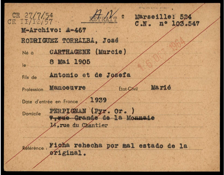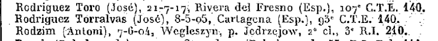 José RODRÍGUEZ TORRALBA (08/05/1905, Cartagena). Hijo de Antonio y de Josefa. Casado y obrero de profesión. Sin datos anteriores a su llegada a Francia, probablemente con la Retirada. Una vez en este país fue encerrado en alguno de los campos para refugiados españoles. Salió adscrito a la 93 Compañía de Trabajadores Extranjeros[1], CTE, con la que fue enviado a la frontera con Alemania, donde miles de españoles trabajaban en la construcción de Línea Maginot El destino de José fue Meuse, concretamente a trabajar en la fortificación de Fermont[2].