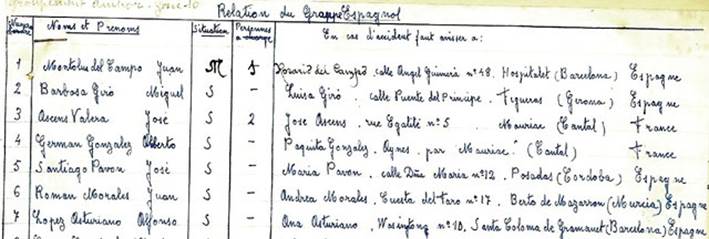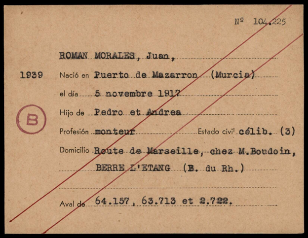 Juan ROMÁN MORALES (05/11/1917, Puerto de Mazarrón). Hijo de Pedro y Andrea. Debió combatir durante la Guerra Civil en España con el ejército republicano. Estaba soltero y era instalador. Con la finalización de la guerra en 1939 cruzó a Francia junto al resto del ejército derrotado. Pasó por los campos de internamiento habilitados por el gobierno francés para recluir a los cientos de miles de españoles que buscaron refugio en este país.