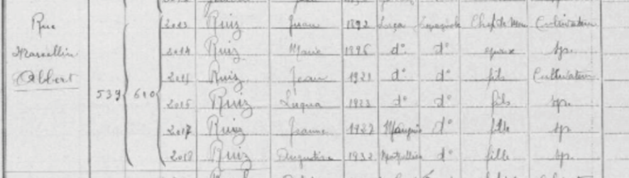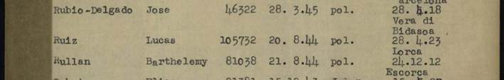 Lucas RUIZ GARCÍA (28/04/1923, Lorca), Hijo de Juan y de María, padres de cuatro hijos. La familia emigró a Francia a mediados de la década de 1920, los padres y los dos hijos mayores. En 1927, cuando nació la tercera hija, ya vivían Mauguio (Hérault). Aún tuvieron una cuarta hija nacida en Montpellier. En Mauguio, la localidad en la que se habían establecido, eran muy numerosos los emigrantes procedentes de Lorca. En 1931 residían en la calle Marcellin Albert y después se trasladaron al Impasse Mullier. El padre era agricultor y no consta si trabajaba para un propietario de la zona. Entonces Lucas era un niño, pero poco después siguió la profesión de su padre y de su hermano mayor.