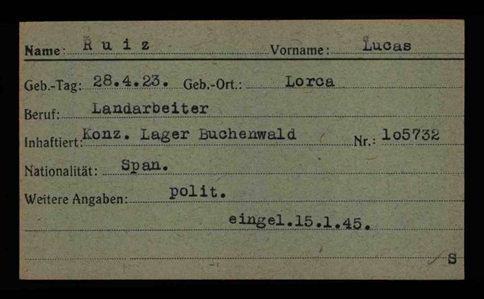 El convoy llegó al campo de Buchenwald el 20 de agosto y Lucas fue matriculado con el número 78.238, alojado en un campamento provisional de tiendas de campaña –Z-, parece que ocupado por los presos antes de ser enviados al kommando de trabajo.