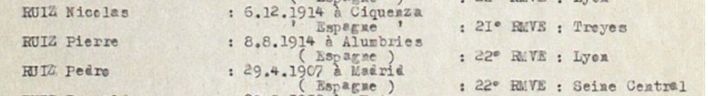 Pedro RUIZ[1] (08/08/1914, Alumbres, Cartagena). La presencia de varias personas en las que coincide nombre, apellido, localidad y fecha de nacimiento, con muy pocas variaciones, ha dificultado el desarrollo de esta historia. No hay otros datos que nos ayuden a clarificarla. En 1939 Pedro se encontraba en Lyon (Rhône). Todo indica que pudo llegar hasta este departamento con los miles de refugiados de la Guerra Civil, pero hay que tener en cuenta que el colectivo de emigrantes económicos en Lyon era muy numeroso.