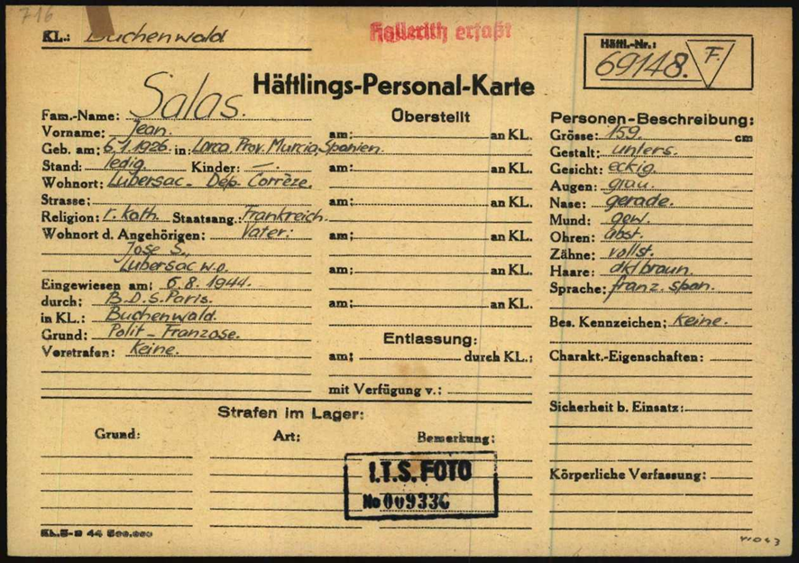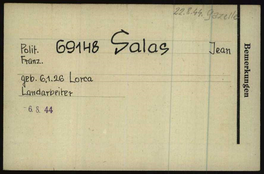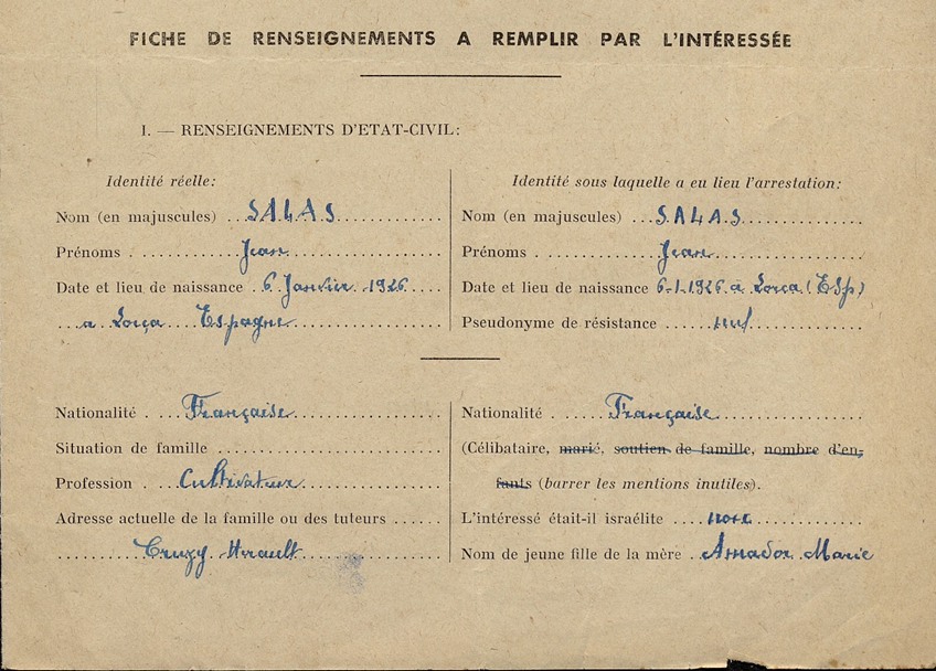 Juan SALAS AMADOR (06/01/1926, Lorca)[1]. Hijo de José y María, padres de cinco hijos. La familia emigró a Francia a finales de la década de 1920, entonces sólo tenían dos hijos, Juan y Ana, los demás nacieron en Francia. A su llegada a este país se instalaron en Beauvoisin (Gard). En 1936 residían en la Avenue de Narbonne, nº 22, en la pequeña localidad de Cruzy (Hérault), donde el padre trabajaba como obrero agrícola con un patrón local. Juan era aún un niño cuando obtuvo la nacionalidad francesa. Después trabajó como jardinero y agricultor. Unos años después la familia se trasladó de nuevo, en esta ocasión a Lubersac (Corrèze). Es muy posible que la familia, y este último traslado, esté relacionada con Jean Salas (22/08/1912, Lorca) militante comunista, secretario del sindicato de trabajadores agrícolas de Cruzy (Hérault) y uno de los principales dirigentes de la huelga que se desarrolló entre el 20 de enero y el 2 de marzo de 1936[2].