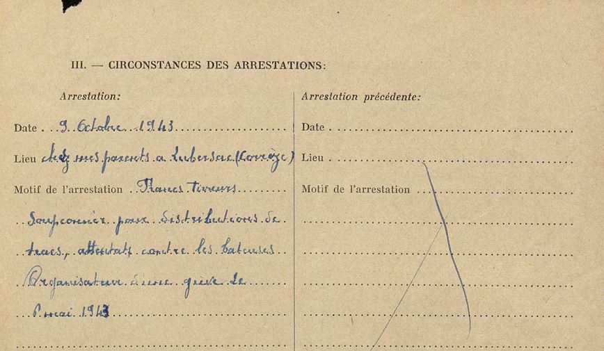 Juan fue arrestado el 9 de octubre de 1943 en su lugar de trabajo, en Lubersac, tras una denuncia. Fue acusado de pertenecer a la Resistencia, a Franco Tiradores y Partisanos Franceses (FTPF), de distribución de propaganda, de participar en atentados y de organizar una huelga en 1943. Su detención no aplacó las iras de los ocupantes y sus colaboradores; la persecución sobre la familia continuó hasta obligar al padre a huir del domicilio tras varias amenazas de detención[3].