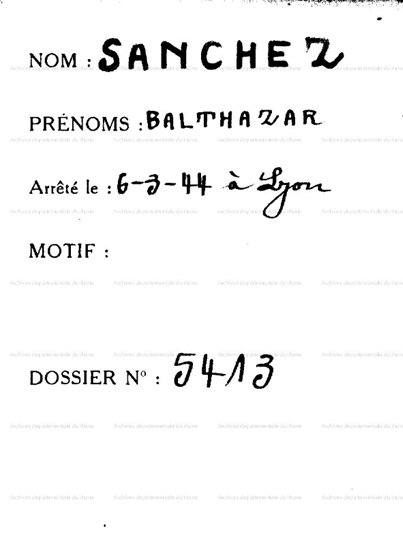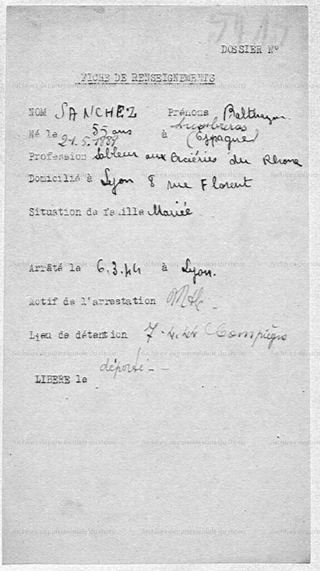 Baltasar SÁNCHEZ PÉREZ (21/05/1889, Puerto Lumbreras). Hijo de Baltasar Sánchez Soler, labrador, y de Isabel Pérez Martínez. Todo parece indicar que emigró a Francia antes de la Guerra Civil española y se había establecido a las afueras de Lyon (Rhône). Tuvo dos direcciones diferentes, el 8 de la calle Florent y el 273 de la route d’Heyrieux. Estaba casado y no consta que tuviera hijos[1]. Trabajaba como pulidor -o haciendo moldes- en la fundición Aciéries du Rhône, especializada en la fabricación de torretas y orugas para carros de combate para la industria armamentística alemana. Muchos de los trabajadores de esta empresa eran militantes muy combativos con el ocupante alemán y el gobierno de Vichy. De hecho, Baltasar fue detenido después de una operación de la Resistencia local, más concretamente del Batallón Carmagnole, que hizo de esta empresa un objetivo prioritario, con el fin de paralizar el abastecimiento de armas a Alemania. El grupo Carmagnole organizó un atentado con explosivos en la fundición el 2 de marzo de 1944 causando destrozos que paralizaron la producción durante quince días.