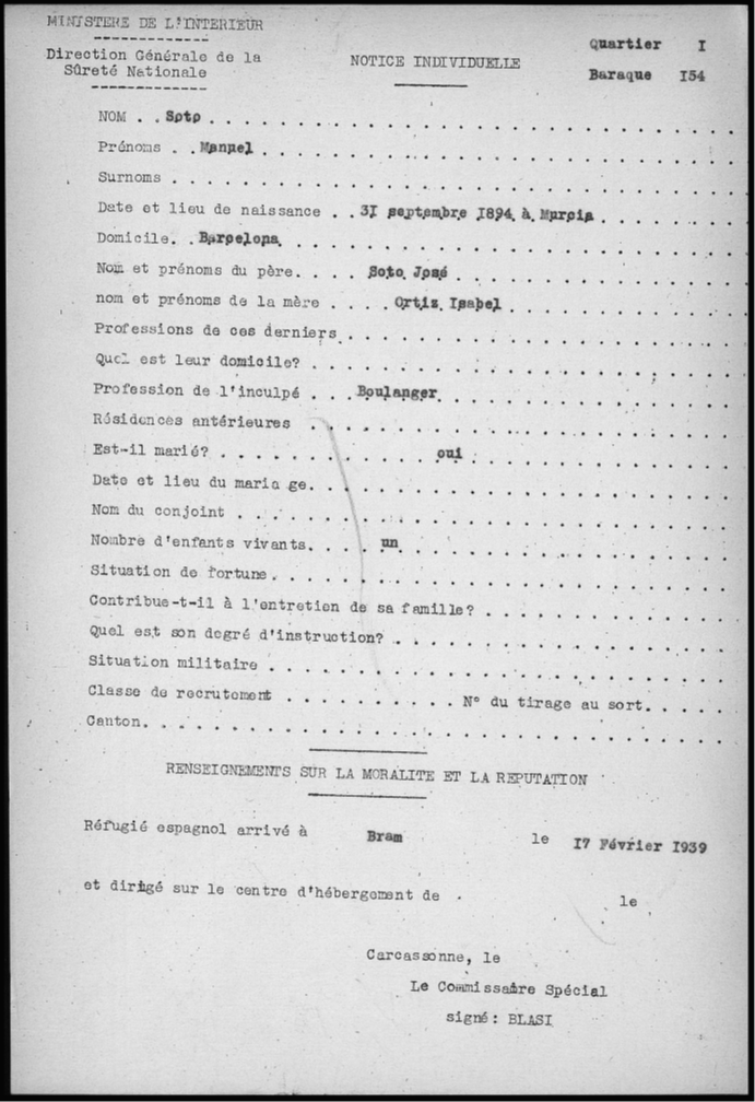 La falta de políticas públicas dejó como única alternativa la emigración, dirigida, en general, a Cataluña y a Francia, movimiento muy significativo tanto por la cantidad de gente que se marchó como por la influencia a nivel de militancia política que representó[2]. Siendo ésta última, a su vez, motivo por el que muchos activistas se vieron obligados a dejar su tierra natal. Ese fue el caso de la familia de Manuel, que en 1918 dejó su pueblo y se dirigió a Barcelona. En este nuevo destino Manuel empezó a trabajar de obrero metalúrgico. Manuel se casó en 1925, en Hospitalet de Llobregat, con Dolores Ferré Martínez, natural de Archena (aunque se separaron en 1939, cuando ya estaban en Francia)[3].