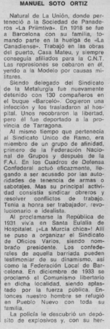 Manuel SOTO ORTIZ (31/10/1894, La Unión). Hijo de José y de Isabel. De joven trabajó en una panadería en La Unión, momento en el empezó a militar en la Sociedad de Panaderos La Primitiva de esta localidad. Fue el inicio de una intensa militancia en las filas anarquistas[1]. Tiempo después Manuel emigró a Barcelona. La Unión, así como el resto de la zona minera, vivía una grave crisis que dejó sin trabajo a muchas familias y en una situación crítica a muchos trabajadores. Panorama descrito por un veterano anarquista de La Unión, Agustín García Meroño, contemporáneo de Manuel: