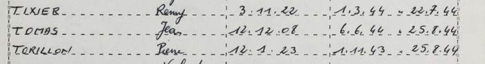 Juan TOMÁS (12/12/1908, Abanilla). Sin datos de la llegada a Francia y la historia posterior al paso por la Resistencia, por lo que no sabemos si era un refugiado político como consecuencia de la Guerra Civil en España o residía anteriormente en este país. En 1944 se encontraba en el departamento de Creuse, en la zona de Guéret. Este departamento acogió en 1939 a una buena cantidad de refugiados españoles. El contingente aumentó a partir de 1940 con el asentamiento en Guéret del 420 Grupo de Trabajadores Extranjeros, del que parte de sus integrantes se incorporaron a la Resistencia.