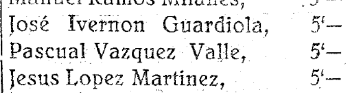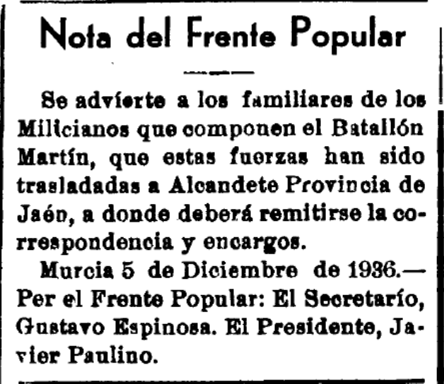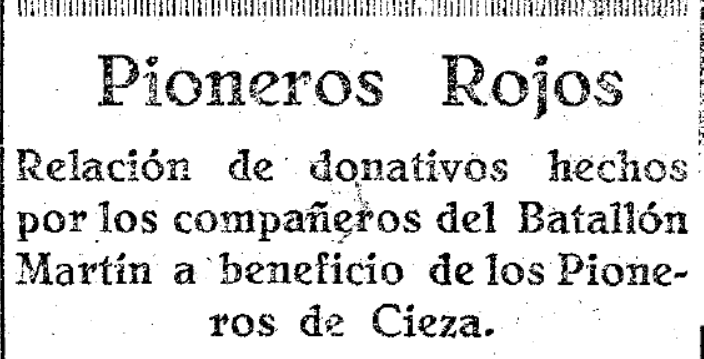 Pascual VÁZQUEZ VALLE[1] (28/12/1901, Cieza). Hilador de esparto, jornalero y frutero. Se casó en 1930 con Mª Josefa Molina. Militante de UGT y las Juventudes Socialistas de Cieza desde 1918[2]. En 1936, al producirse el Golpe de Estado, se incorporó a las Milicias Populares murcianas, Batallón nº 2 o Batallón Martín. En noviembre de 1936 este Batallón fue enviado a Alcaudete, frente de Jaén, y en enero de 1937 tomó parte en la operación sobre la Sierra Vizcántar, ocupando este objetivo[3]. El Batallón formó parte de la 76 Brigada Mixta. Desde esta localización realizó un donativo a beneficio de los Pioneros Rojos de Cieza.