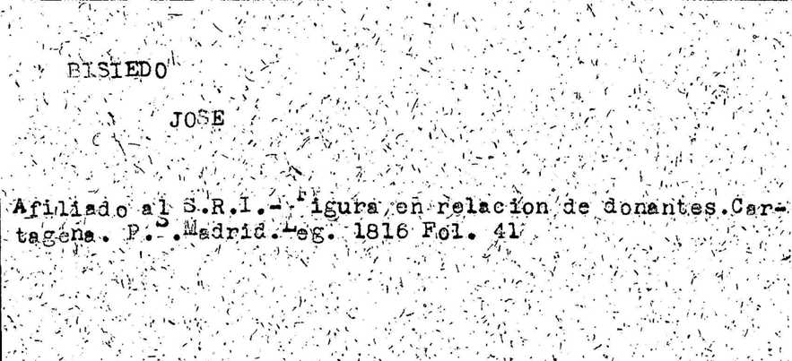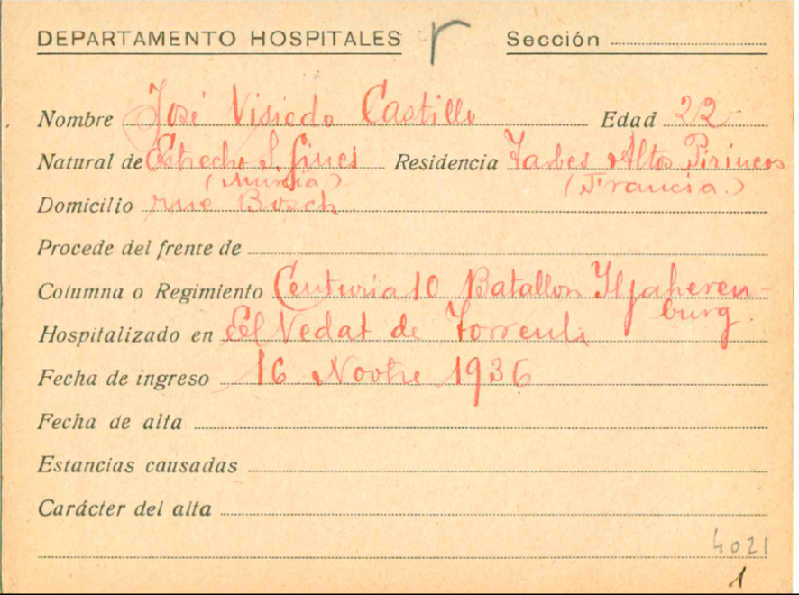 José VISIEDO CASTILLO (24/04/1914, Cartagena). Era natural del Estrecho de San Ginés. Todo parece indicar que la familia había emigrado a Francia y se habían establecido en Tarbes. José volvió a España para luchar en la Guerra Civil en el seno de las Brigadas Internacionales, Centuria 10, Batallón Ilya Ehrenburg (corresponsal de guerra ruso). El 11 de noviembre de 1936 ingresó, por reumatismo, en el Hospital de Sangre Vedat (Torrent, Valencia), donde fue registrado como vecino de Tarbes[1]. Afiliado al Socorro Rojo Internacional en Cartagena, del que era donante[2].